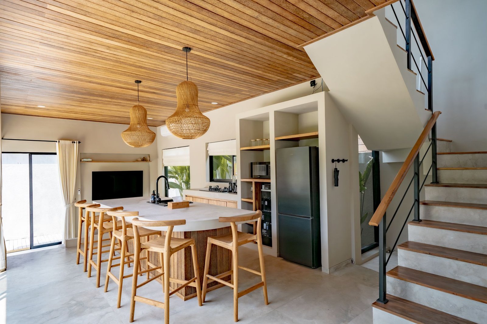 The indoor living area opens directly to the pool and features a comfortable sofa and a 65-inch TV. This simple, relaxed space works well for quiet evenings or casual time together. Adjacent to the living area, the kitchen is fully equipped with cooking and dining essentials, making shared meals easy and enjoyable.