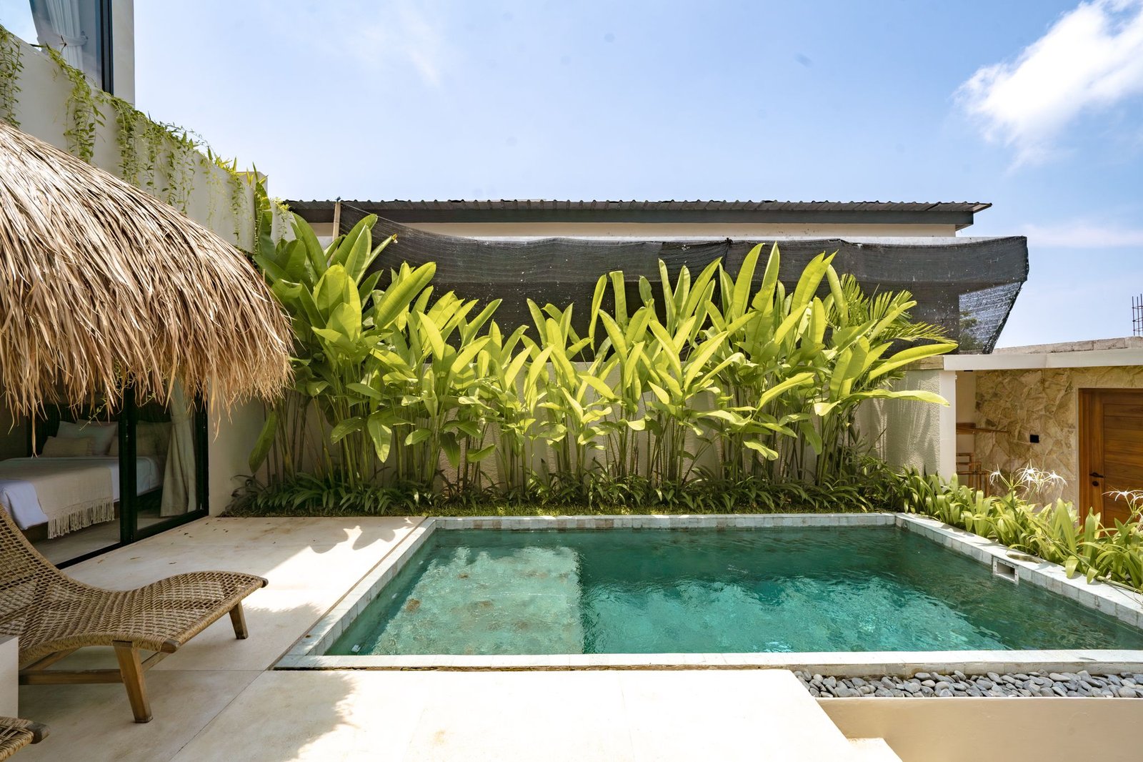 As you enter the villa, the first thing you notice is the long private pool that runs alongside the main living area. Surrounded by lush greenery, it becomes the heart of the home. The sun deck is a perfect spot for morning swims, relaxed afternoons, or winding down after a day out in Uluwatu.