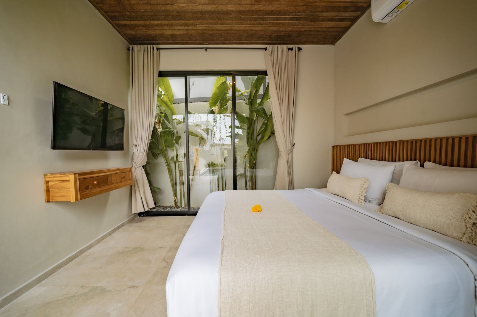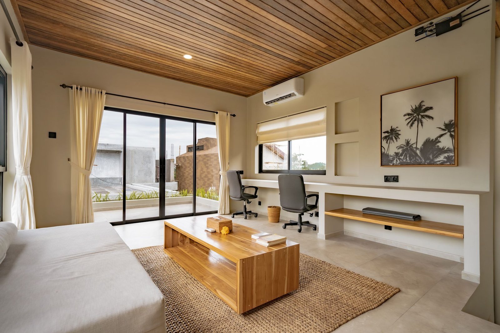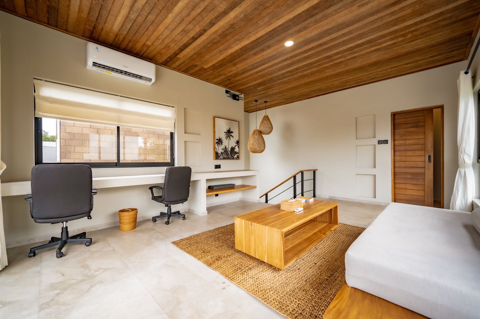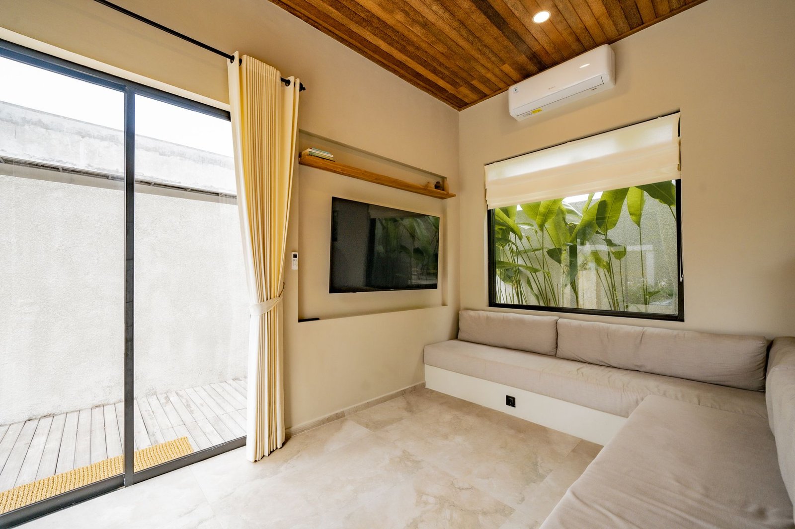 Upstairs, a cozy lounge area serves as a work-friendly space with fast Wi-Fi. From here, you can step onto the balcony overlooking the pool, allowing fresh air and natural light to flow in. The master bedroom features a king-size bed, a 43-inch TV, a private ensuite bathroom, and its own balcony facing the pool, offering a quieter, more private retreat within the villa.