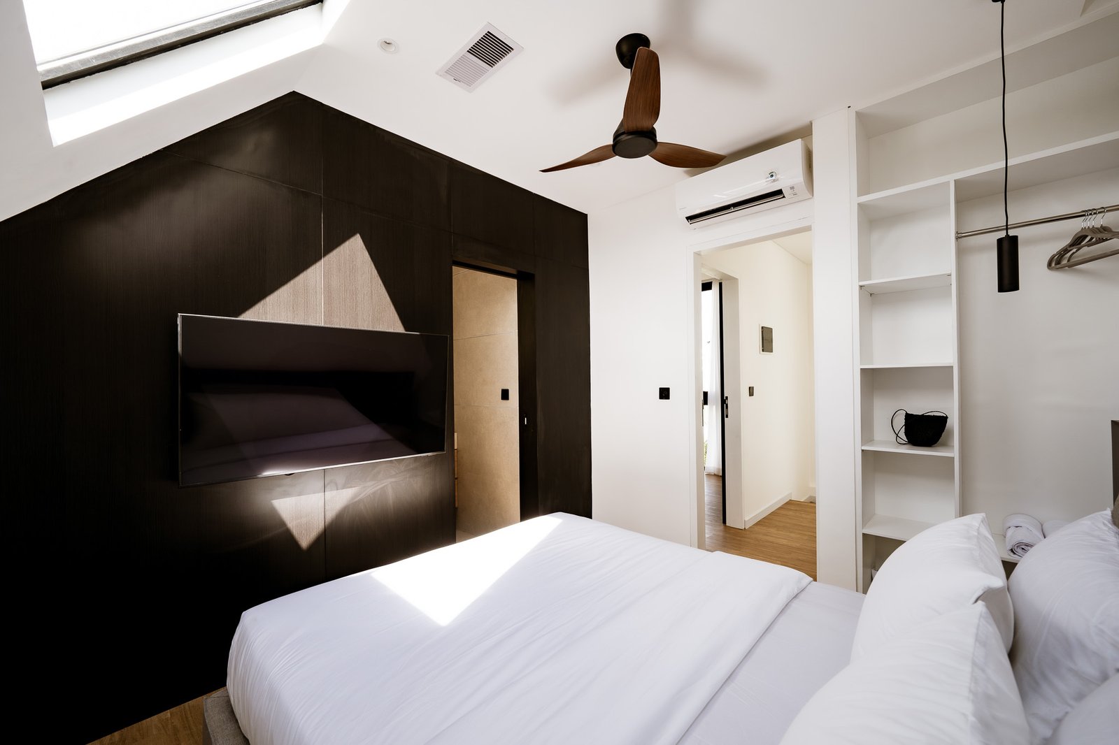 Upstairs, you will find two serene bedrooms. The master bedroom offers direct views of the pool, a TV, and a private bathroom for your comfort. The second bedroom is bright and airy, featuring a skylight, its own TV, and a private bathroom as well. Whether you are a couple, a group of friends, or a small family, this villa serves as an excellent base to enjoy Bingin’s waves, Uluwatu’s vibrant scene, or peaceful days in your own private retreat.