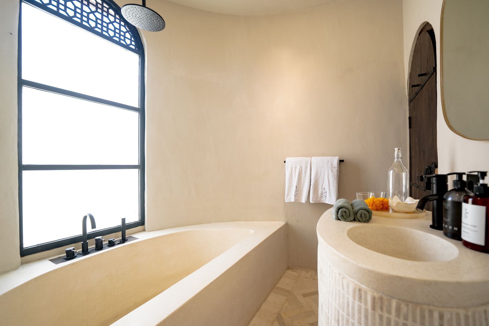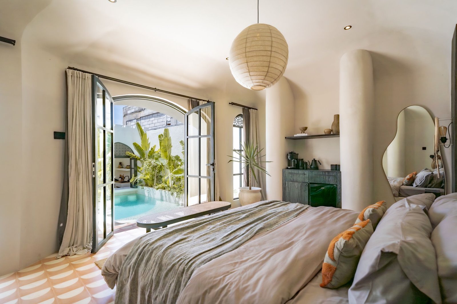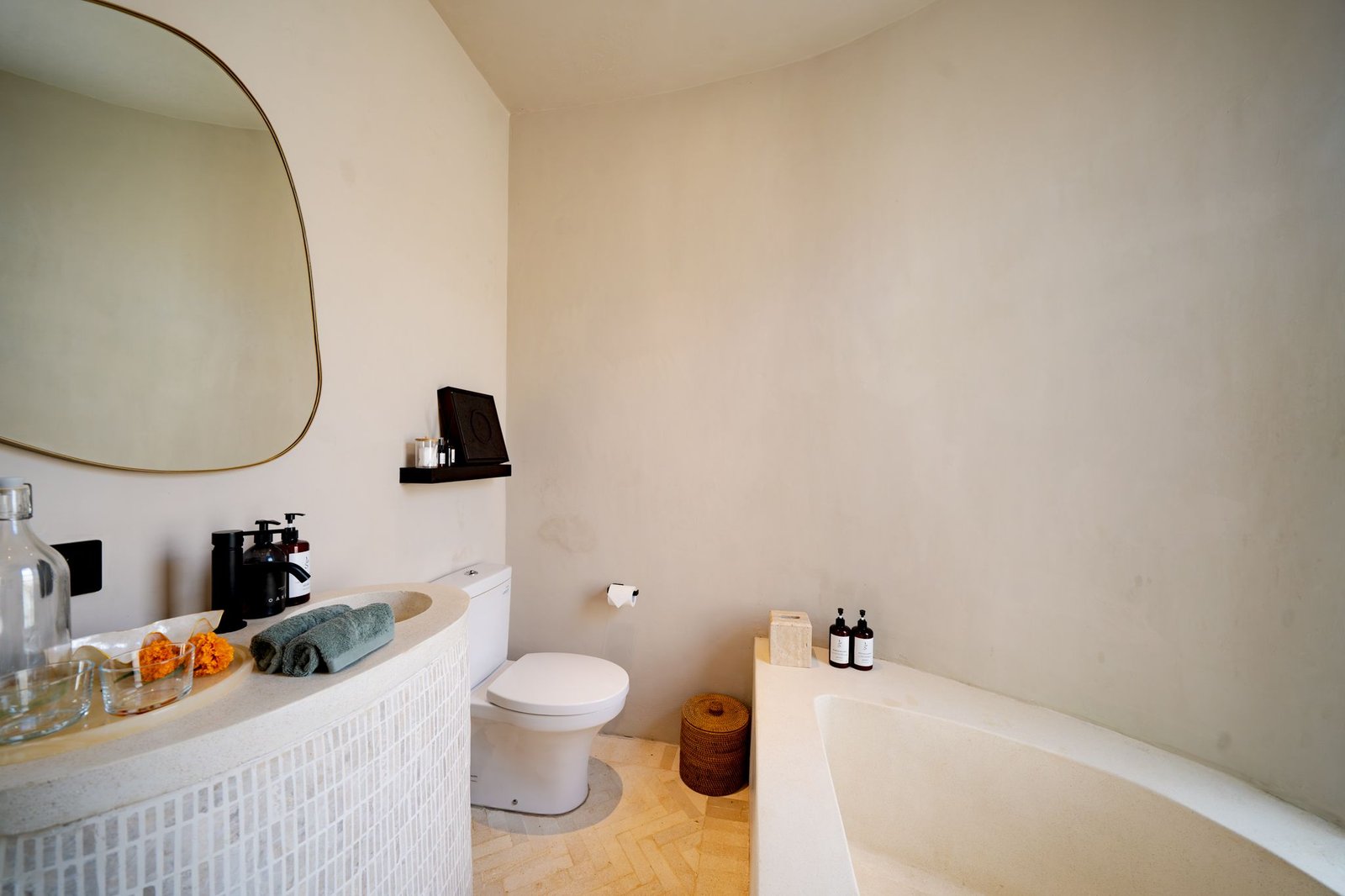 Both bedrooms open directly to the pool and include king-size beds, private ensuite bathrooms, and bathtubs for long, relaxing soaks. Designed with comfort and functionality in mind, each space ensures a pleasant and restful stay.