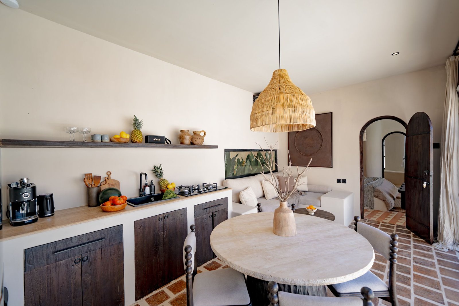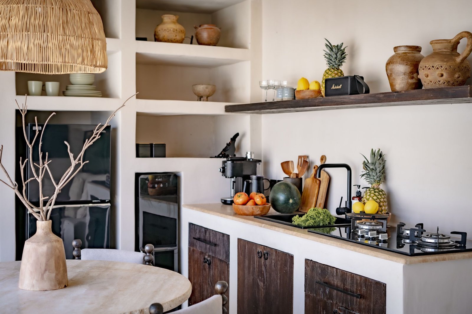 The sunken kitchen, located near the pool, is fully equipped for everyday cooking and relaxed dining. Warm textures, earthy tones, and handcrafted Moroccan–Mediterranean details create an intimate social space for shared meals and quiet moments after a day at the beach.