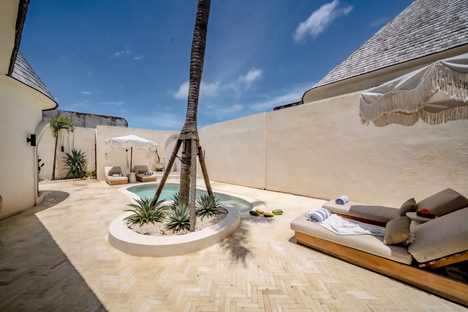 The villa is centered around a curved private pool, framed by palm trees and a cozy sun deck. Its open layout promotes a smooth indoor–outdoor flow, creating a comfortable environment for leisurely mornings, sunny afternoons, and relaxed evenings.