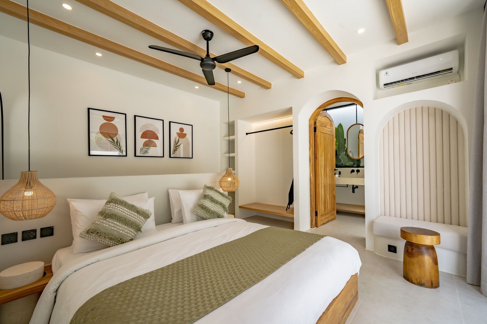 Both bedrooms are designed for comfort and convenience, each featuring a king-size bed, a dedicated work desk, and direct access to the swimming pool, allowing you to step straight from your room into the water. Each bedroom also includes a private en-suite bathroom with a bathtub, providing a relaxing space to unwind after a day at the beach, exploring cafes, or enjoying sunset views in Bingin.
