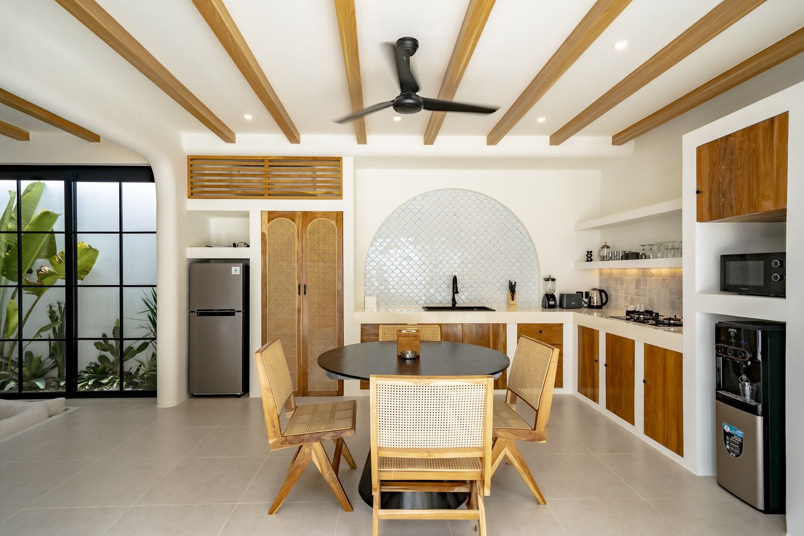 Inside, the villa is thoughtfully designed with modern luxury touches. It includes a fully equipped kitchen complete with cooking and dining utensils, positioned beside a round dining table that seats four—perfect for shared meals. The sunken living room invites you to unwind on a plush sofa while enjoying your favorite shows on the 50-inch TV.